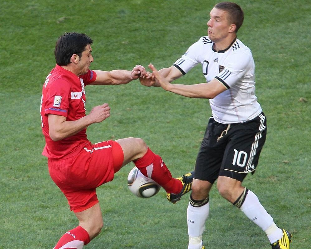 Alles andere als Händchenhalten: Serbiens Gojko Kacar (links) im Duell mit Lukas Podolski.
