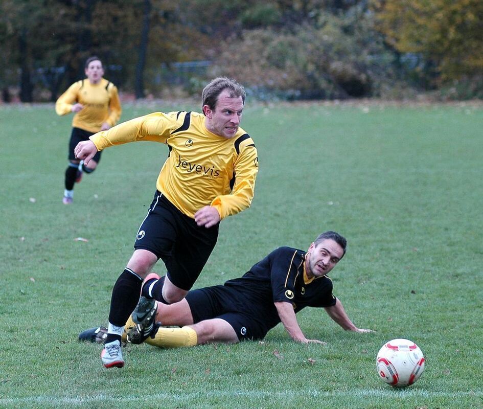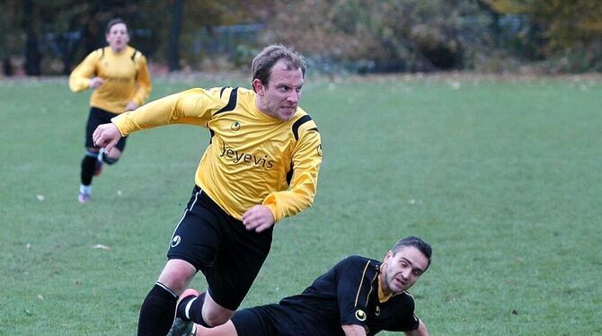 Nutzt die Gelegenheit: Betzingens Georg Grimm (links) macht sich auf den Weg zum 1:0, nachdem Degerschlachts Michael Axtmann (am Boden) den Ball verfehlte.