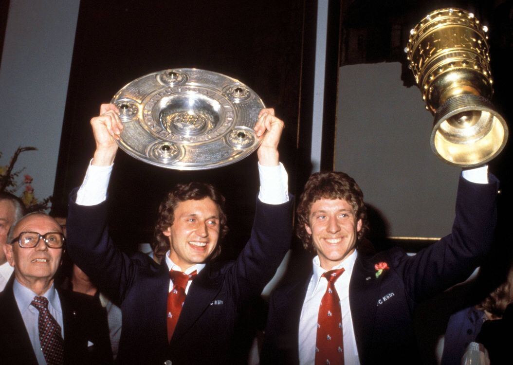 Mit Schlips, Schale und Pott: die jungen Kölner Fußball-Helden Heinz Flohe (links) und Harald Schumacher als Double-Gewinner. FOTO: IMAGO