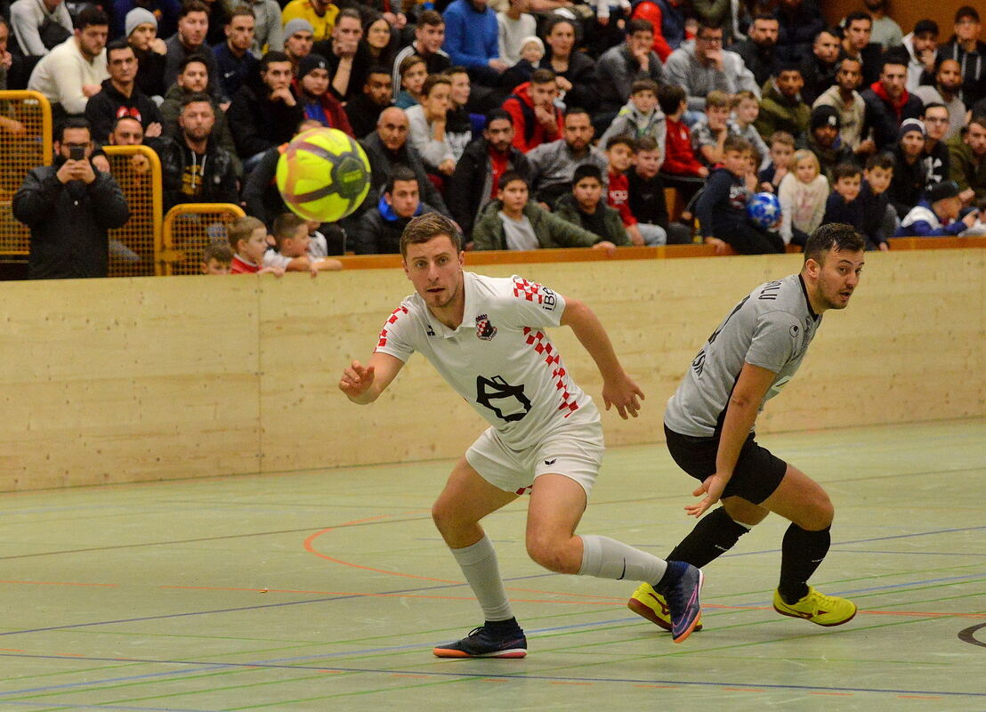 Beim Budenzauber mit Rundum-Bande in der Mössinger Steinlachhalle standen sich die Reutlinger Clubs Anadolu (rechts Aslan Albay) und Croatia (links Tomislav Cilic) im Finale gegenüber. FOTO: NIETHAMMER