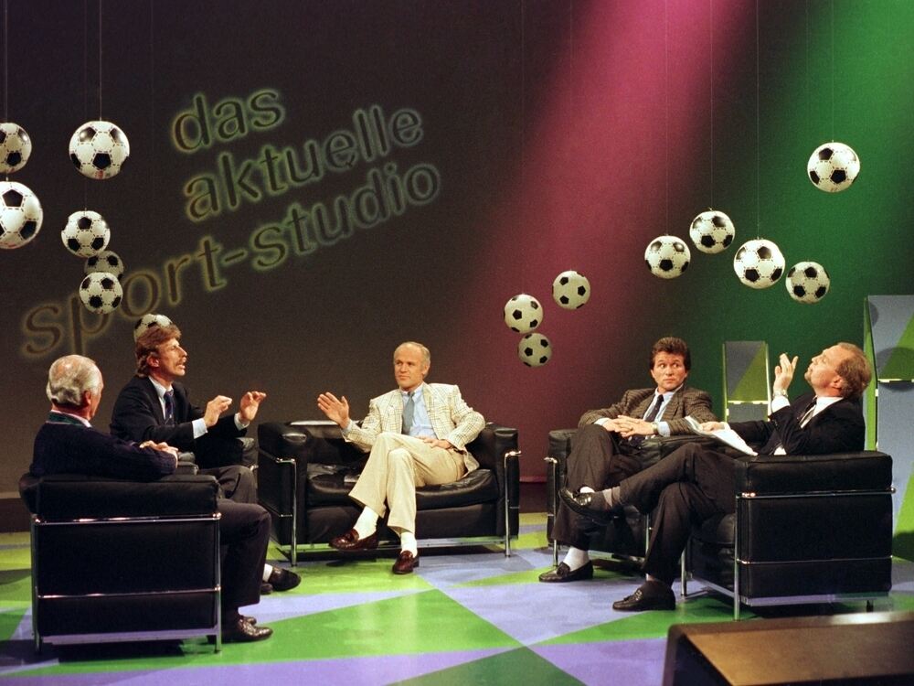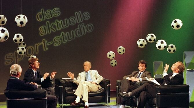 »Was da über dir hängt, ist kein Heiligenschein.« Christoph Daum und Uli Hoeneß im verbalen Clinch, Bernd Heller als Ringrichter und die Sekundanten Udo Lattek und Jupp Heynckes – ein denkwürdiger Auftritt im ZDF-Sportstudio. FOTO: ALFRED HARDER