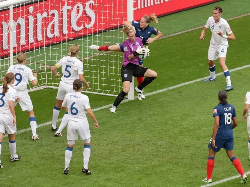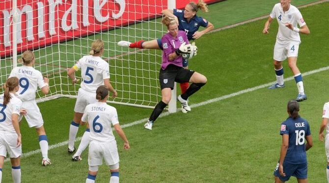 Torhüterin Karen Bardsley (M) sichert den Ball vor Frankreichs heranstürmender Laure Lepailleur.