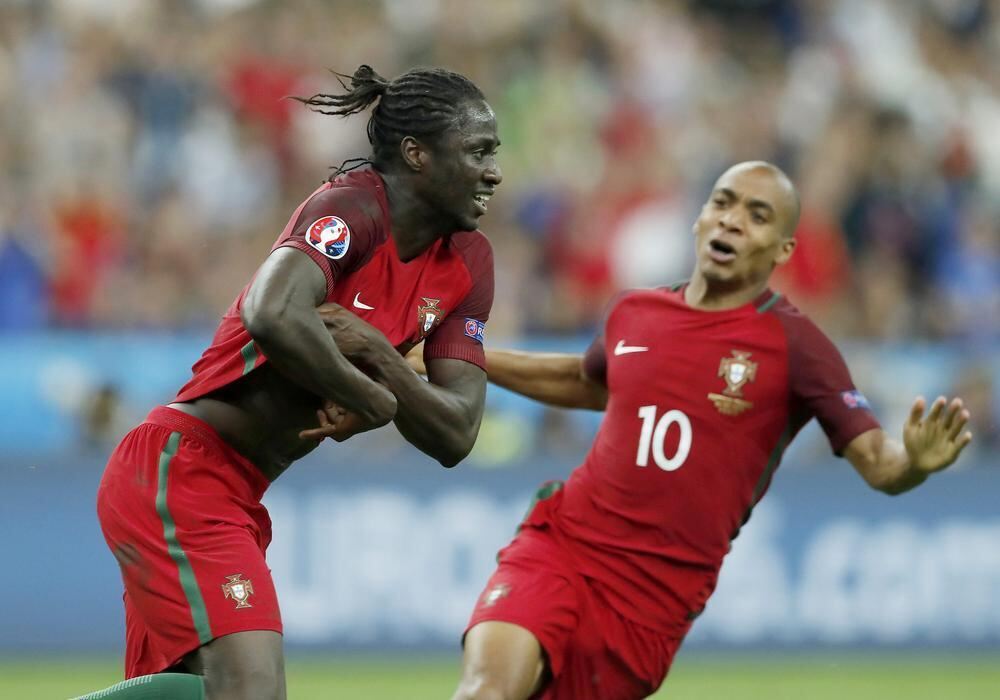 Falter als Endspiel-Besucher.Freudentaumel: Portugals Siegtorschütze Eder (links), in Guinea-Bissau geboren, und Joao Mario nach dem Treffer in der Verlängerung. FOTOS: WITTERS