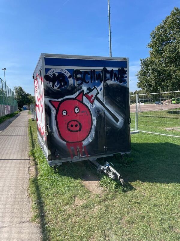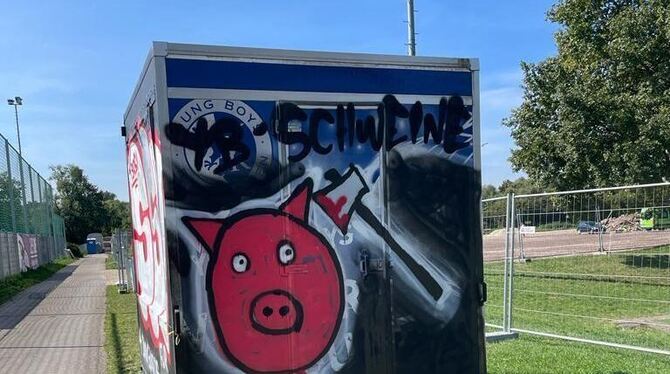 REUTLINGEN. Ein Schwein mit einem blutigen Beil, »die Nummer eins der Stadt sind wir - SSV«, »vier Bodyguards für Thorsten«, »Peppe, halt's Maul.« Der Würstchenwagen des Fußball-Landesligisten Young Boys Reutlingen an der Kreuzeiche wurde in der Nacht von Donnerstag auf Freitag mit geschmacklosen Schmierereien verunstaltet. »Wir wollen erst mit den Behörden sprechen und uns intern zusammensetzen«, kommentierte Young-Boys-Abteilungsleiter Marcel Laaß diesen Vorfall.
