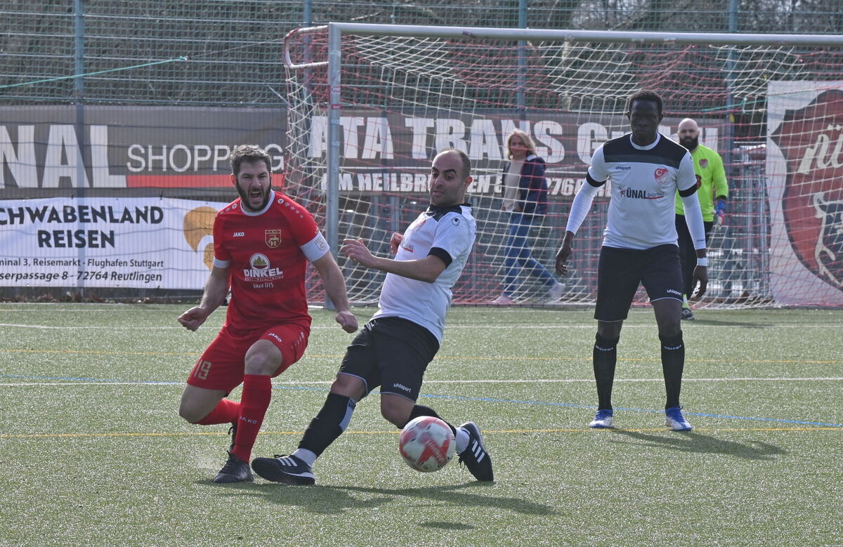 Der Bezirksliga-Top-Torjäger zeigt sich auch beim 4:0-Erfolg gegen die TuS Metzingen treffsicher: TSV Hirschaus Cihan Canpolat (links), der nach 22 Spieltagen bereits bei 26 Treffern steht. Hier Anfang März im Duell mit Mehmet Caran von Anadolu Reutlingen. FOTO: MEYER