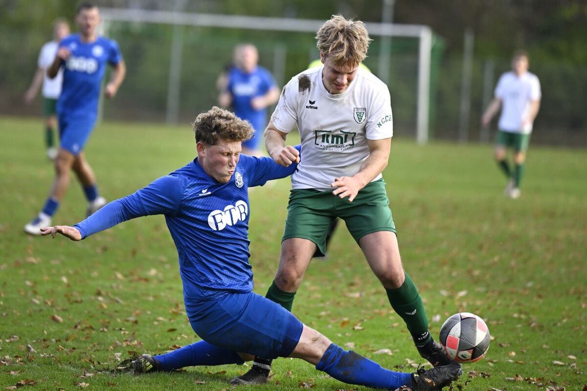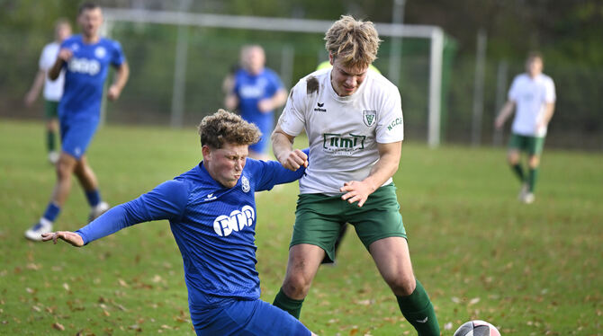 Dieses feurige Duell gibt es auch in der bevorstehenden Saison: Maurice Heim (blaues Trikot) vom Aufsteiger SV Walddorf stoppt in dieser Szene Julius Raiser vom Mitaufsteiger TSV Sickenhausen. Foto: Frank Pieth