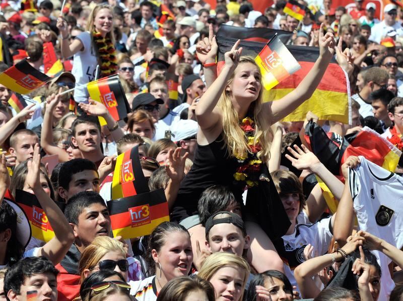 Fußballfans feiern die deutsche Nationalmannschaft beim Public Viewing in der Innenstadt von Frankfurt am Main.