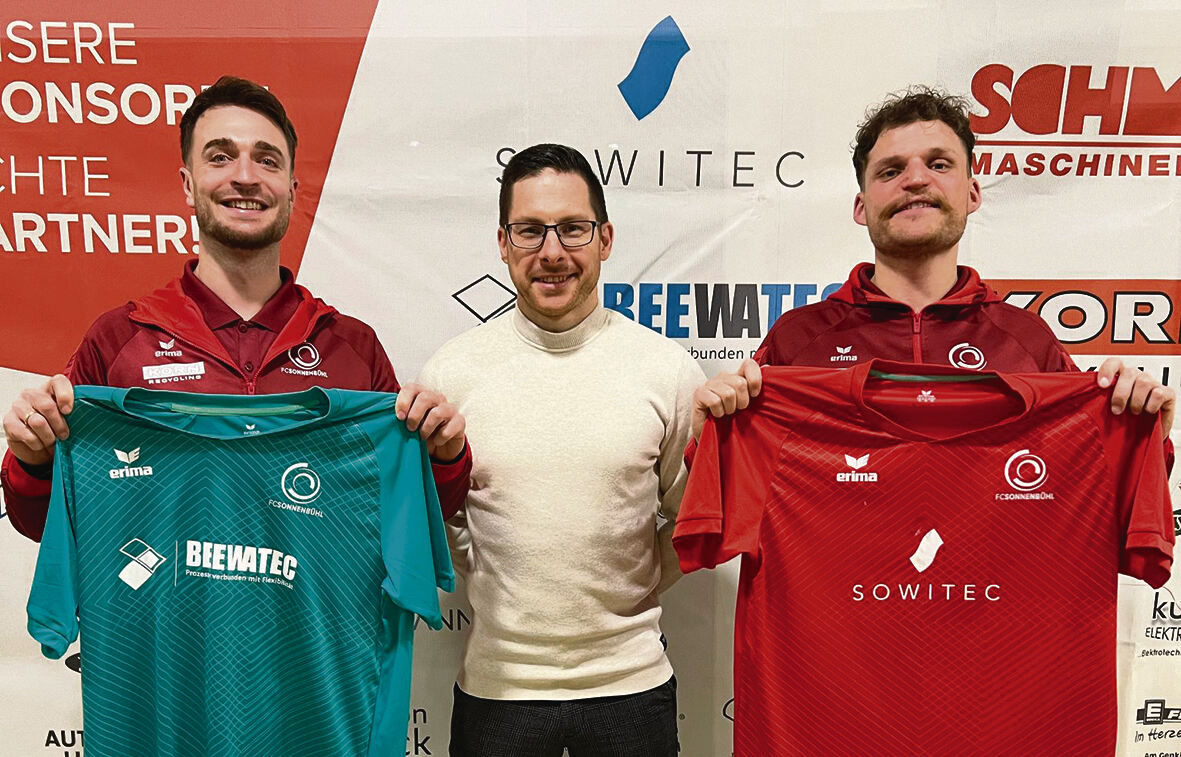 Eingerahmt von den Vorstandsmitgliedern Manuel König (links) und Dennis Bächle (rechts): Jonathan Knehr, der neue Trainer des A-Ligisten FC Sonnenbühl.