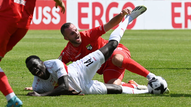 Voller Einsatz: Der Balinger Jonas Vogler stoppt Silas vom VfB Stuttgart. FOTO: STEIN/DPA
