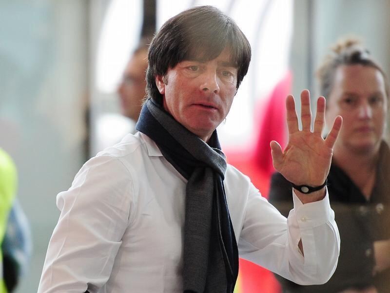 Bundestrainer Joachim Löw winkt vor der Abreise auf dem Flughafen Tegel in Berlin zu Fans.