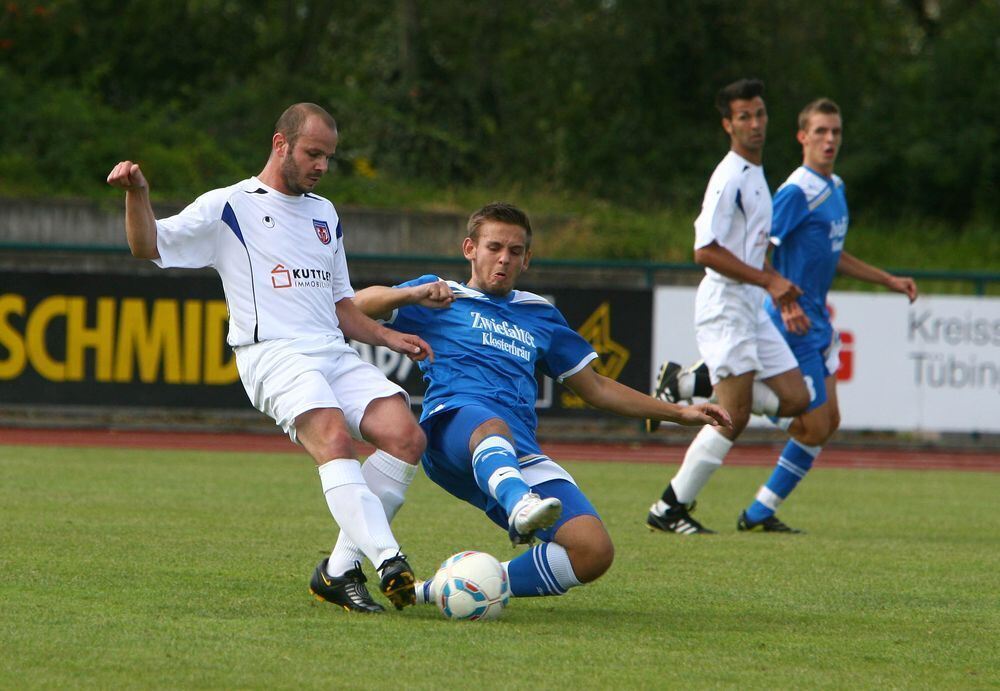 Gomaringens Spielertrainer Jan Hoffmann (links) wird hier vom TSGler Alexander Tadic (rechts) gestoppt. Teamkollege Panagiotis Nakos erzielte das Tor des Tages.