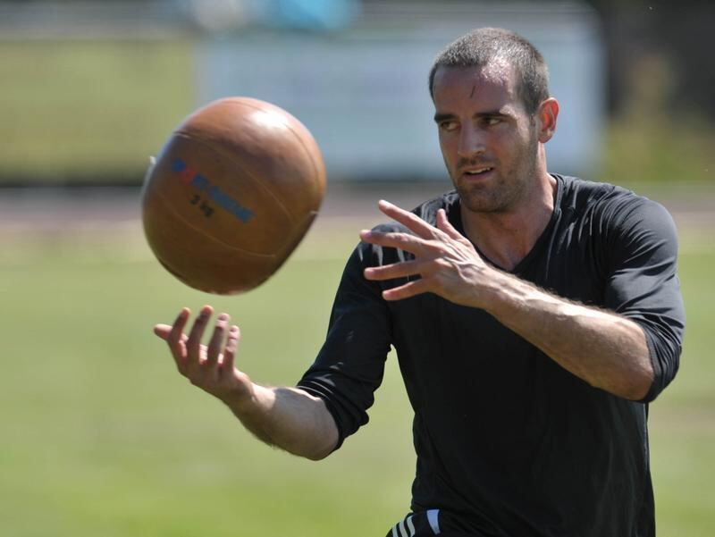 Christoph Metzelder quält sich im Schalke-Training mit einem Medizinball.