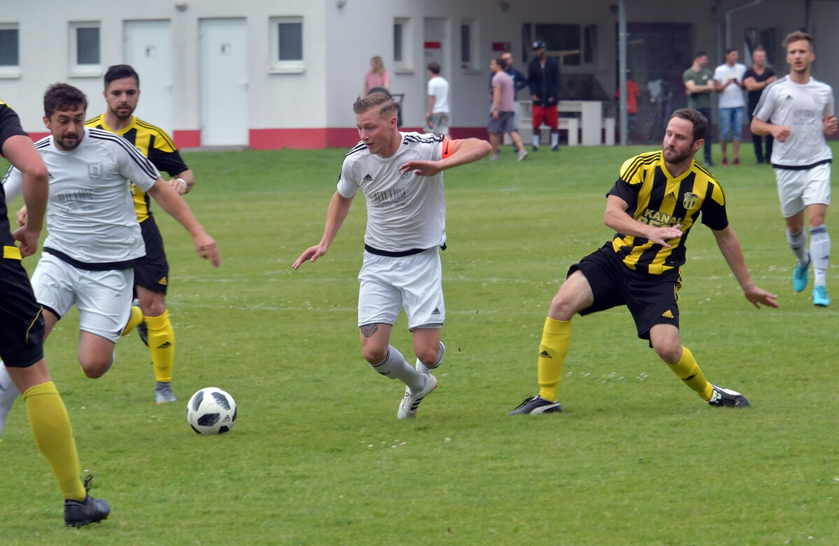 Dußlingens Kapitän Manuel Binder (Mitte) und Maximilian Braun machen Dampf. Alexander Bez (rechts) vom TSV Dettingen hat das Nachsehen. FOTO: MEYER