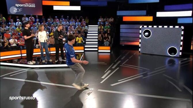PFULLINGEN. Da kam selbst Fußball-Nationalspieler Maximilian Mittelstädt ins Staunen. Verwundert und mit großen Augen schaute der Linksverteidiger des VfB Stuttgart in Richtung des deutschen Eishockey-Stars Moritz Seider und klatschte den über beide Wangen strahlenden Tom Ankele ab. »Wahnsinn. Das gibt's ja nicht«, meinte ZDF-Moderatorin Katrin Müller-Hohenstein zur Performance des Mittelfeldspielers vom Fußball-Verbandsligisten VfL Pfullingen an der legendären Torwand des Sportstudios am Samstagabend.