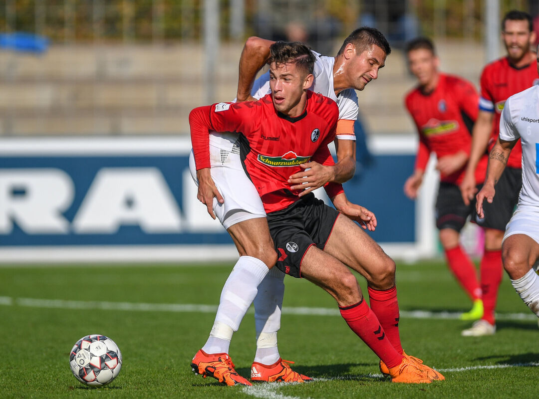 Ingo Haspel über den Ex-SSVler Marvin Pieringer (im roten Trikot des SC Freiburg II): »Marvin bringt viele Anlagen mit« FOTO: EIBNER