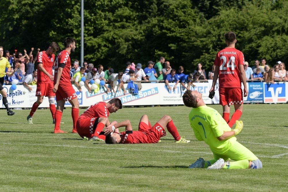Während Freudenstadts Torhüter Johannes Günter jubelt, herrscht bei den Croatia-Spielern (von links) Fran Radman, Mirko Jelcic, Mile Dugandzic, Niko-Kresimir Petrovic und Fabijan Kraljevic große Enttäuschung. Foto: Baur