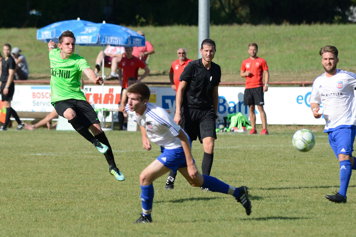 Zieht im Finale gegen den TSV Gomaringen wuchtig ab: Steffen Schanz (links) vom SV Nehren.