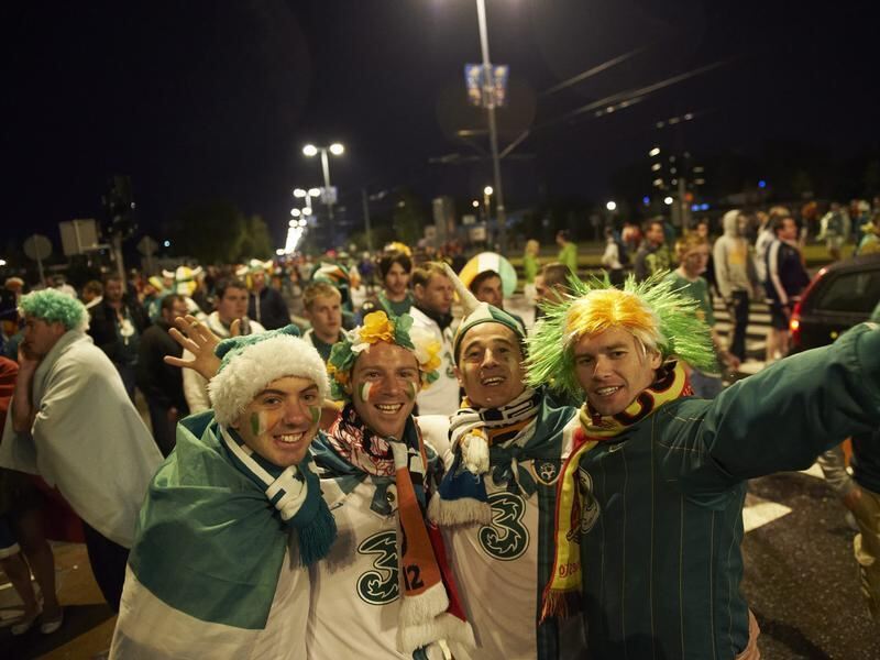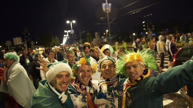 Sie kamen, verloren und gewannen am Ende irgendwie doch: Irische Fans in Begleitung spanischer Anhänger nach dem mit 0:4 verlorenen Spiel in Danzig. Foto: Adam Warzawa