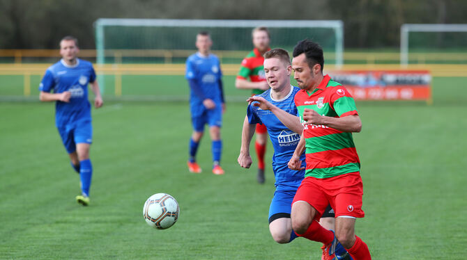 Michael Barth (rechts) vom SV Nehren setzt sich in dieser Szene gegen den Seedorfer Tom Ritzel durch. Die Partie endet jedoch 0:0-Unentschieden. FOTO: LANGER
