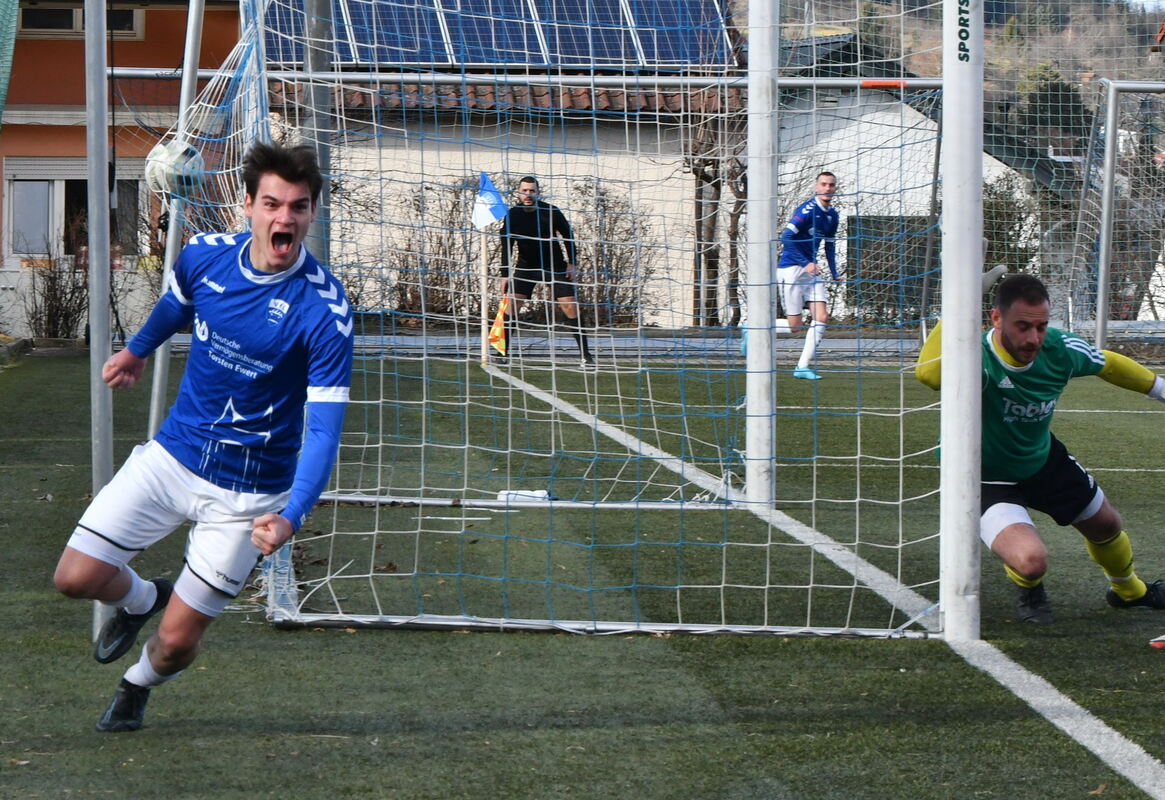 VfL-Innenverteidiger Maximilian Herberth (links) jubelt nach seinem Kopfballtreffer zum 2:0. Heimerdingens Torhüter Lukas Emmrich hat nicht nur in dieser Situation das Nachsehen.