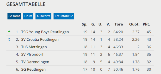 In der Bezirksliga rangierten etwa der TSV Ofterdingen (Platz 16), die TSG Upfingen (15) und der VfL Pfullingen II (14) unter dem Strich. Eine Klasse tiefer gab es abgeschlagene Teams im Tabellenkeller wie in der Kreisliga A Münsingen den WSV Mehrstetten (Platz 16/5 Punkte) und den FC Engstingen II (15/8) sowie in der Kreisliga A2 den TSV Oferdingen (15/7) und den TSV Eningen II (14/8).