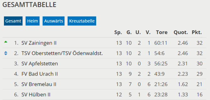 Noch knapper ging es in manchen B-Ligen zu. In der Staffel 2 hatte der FC Dottingen-Rietheim den gleichen Quotienten (2,62) wie Spitzenreiter SGM Honau/Holzelfingen, aber eine um 15 Tore schlechte Tordifferenz. Noch knapper ging es in Staffel 1 zu, wo die SGM Oberstetten/Ödenwaldstetten mit dem gleichen Quotienten (2,46) wie der SV Zainingen II nur um ein Tor schlechter war. Doch die Zaininger verzichteten auf den Aufstieg, weil schon ihre erste Garde in der Münsinger A-Liga spielt. So folgte wenigstens bei Oberstetten/Ödenwaldstetten auf die erste Enttäuschung doch noch die Freude über den Aufstieg. (GEA)