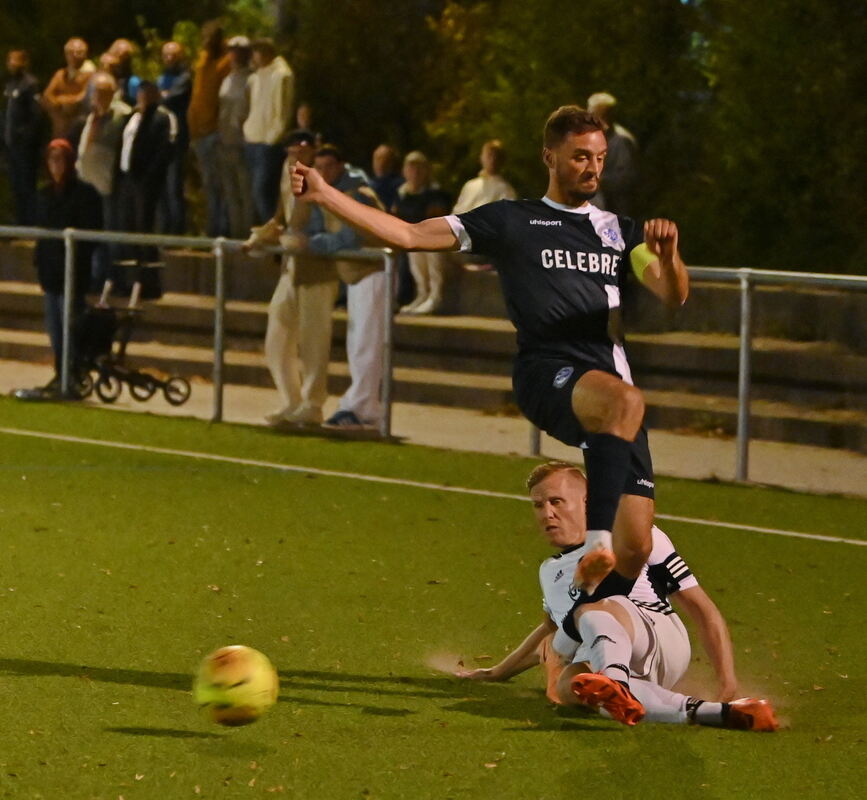 Young Boys Reutlingens Torschütze Hakan Aktepe obenauf, Gechingens Dennis Carl am Boden.