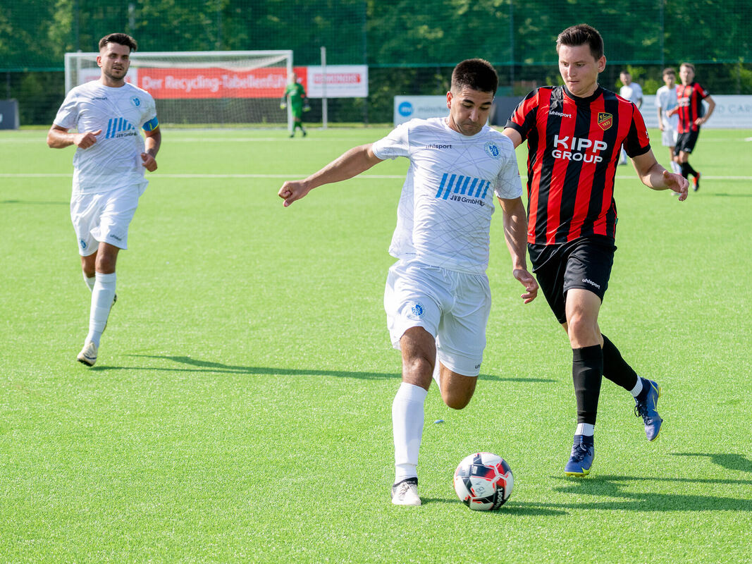 Dan Constantinescu (am Ball), neu bei den Young Boys Reutlingen, im Zweikampf mit dem Ex-SSVler Aaron Leyhr vom FC Holzhausen.
