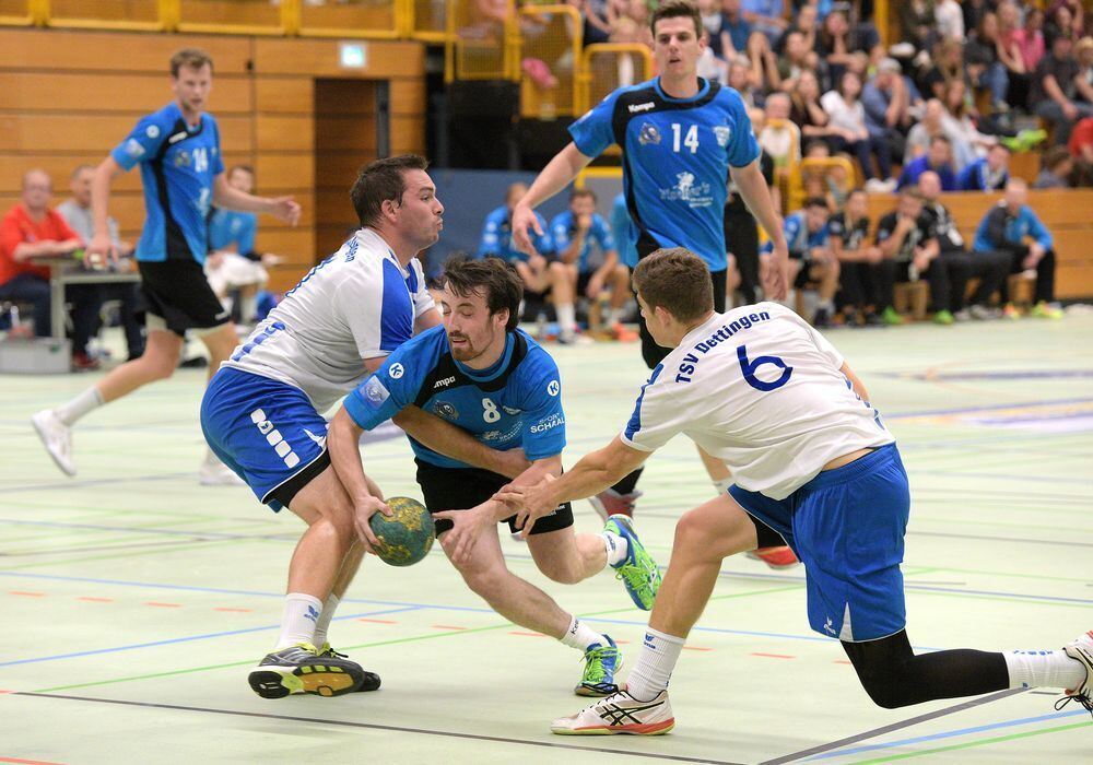 Mössingens Daniel Braunstein (mit Ball) im Duell mit den Dettingern Marc Euchner (links) und Maximilian Fritz. FOTO: BAUR