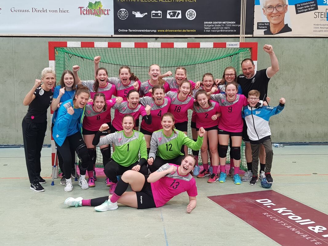 Die B-Jugend der TuS Metzingen, hinten von links: Trainerin Edina Rott, Selina Leibfarth, Merit Deutscher, Ronja Slawitsch, Rebecca Rott, Jette Widmer, Hannah Streubel, Helen Floredo, Trainer Mirko Streubel, 2. Reihe von links: Evi Seiffert, Nicole Lauer, Sabrina Tröster, Lisa Laux, Emma Schweizer, Celine Lauer, Corinna Welser, Fan Fredi; kniend von links: Ina Federschmidt, Marie Weiss; vorne: Vivien Natalello. F.: VEREIN