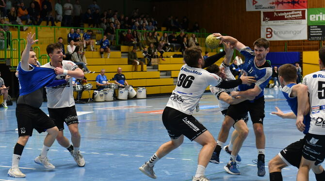 Philipp Mager wird in dieser Szene erfolgreich gestört. Doch dem Pfullinger Rückraumspieler gelangen dennoch acht Feldtore. FOTO: MEYER