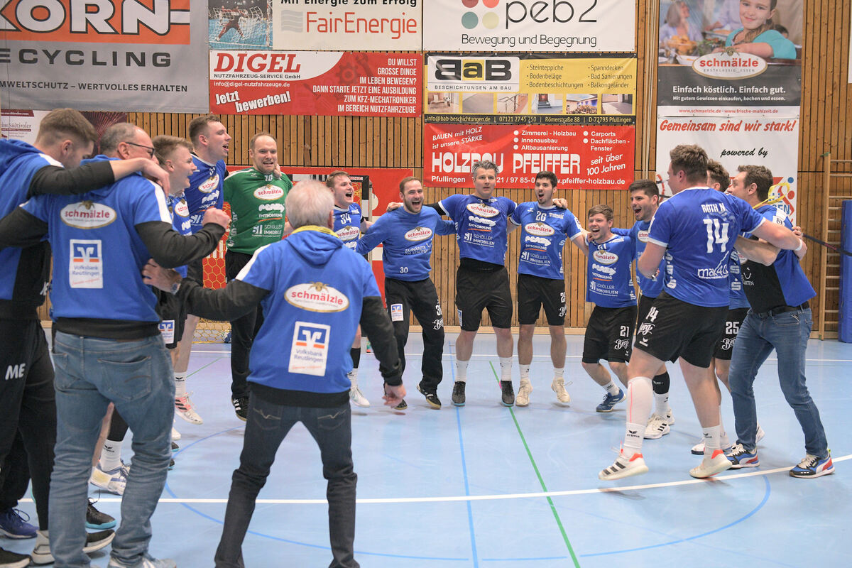Die Handball-Mannschaft am Jubeln nach dem Sieg im Spitzenspiel.