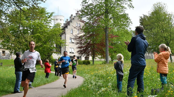 Anfeuern vor der Schlosskulisse: Halbmarathonläufer des Lichtenstein-Trails beim Umrunden des Echaztals. FOTO: MEYER