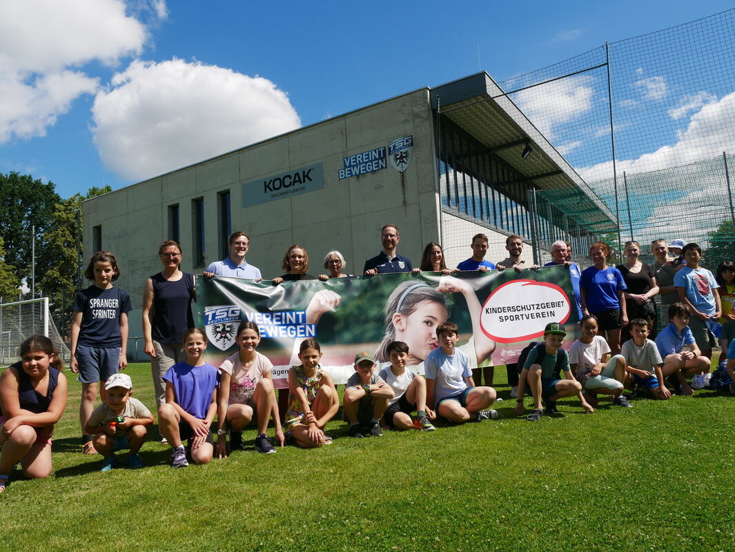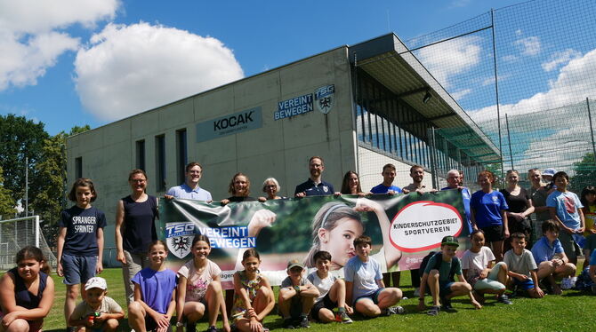 Ein Banner der Württembergischen Sportjugend hat die TSG Reutlingen für jenes Kinderschutzkonzept verliehen bekommen, das der Verein künftig leben will.