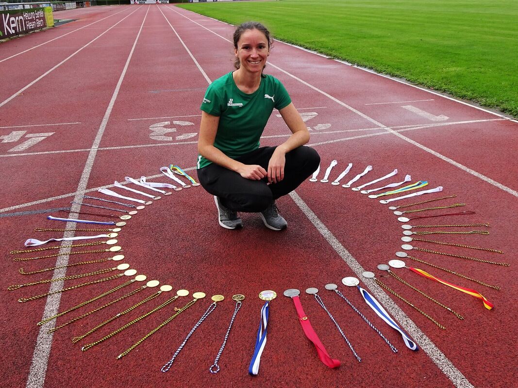 Die Pliezhäuserin Julia Rieger inmitten all ihrer Medaillen.
