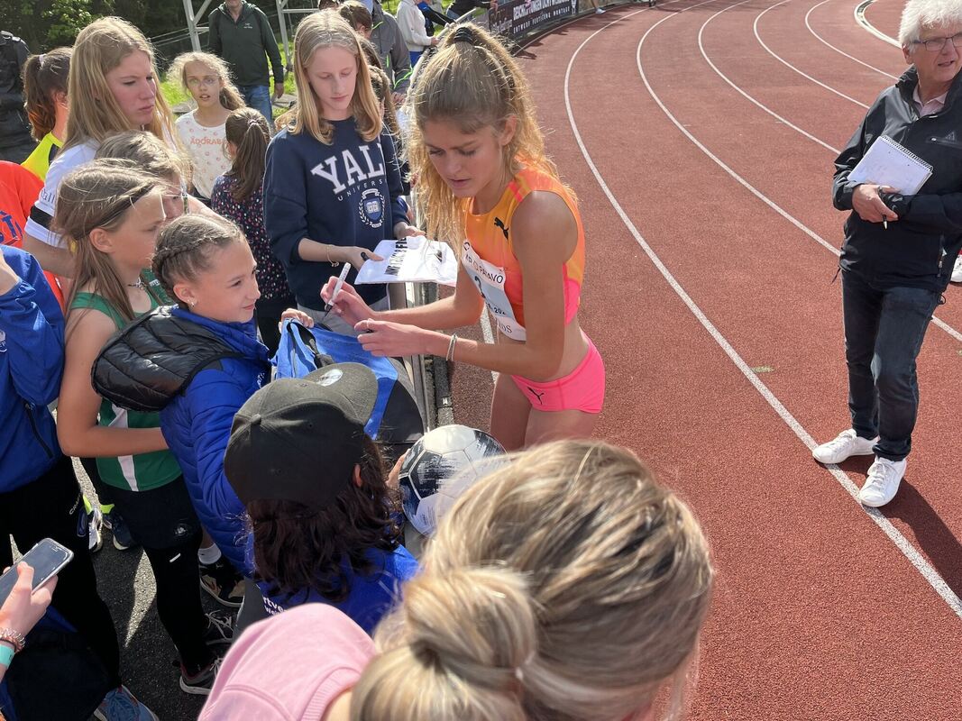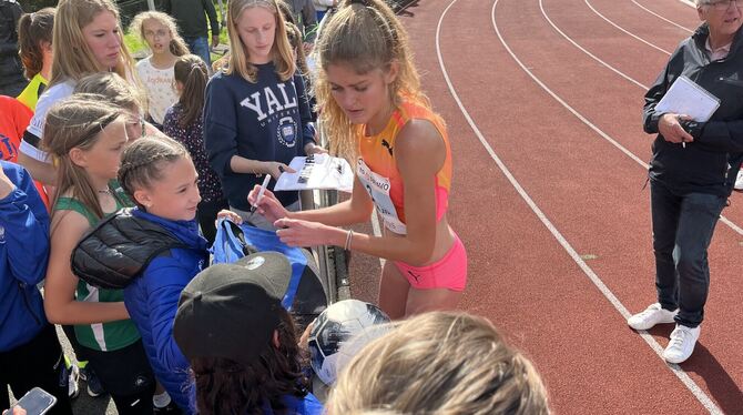 Star zum Anfassen: Konstanze Klosterhalfen gibt im Schönbuchstadion in Pliezhausen Autogramme. FOTO: KUNZ/DPA