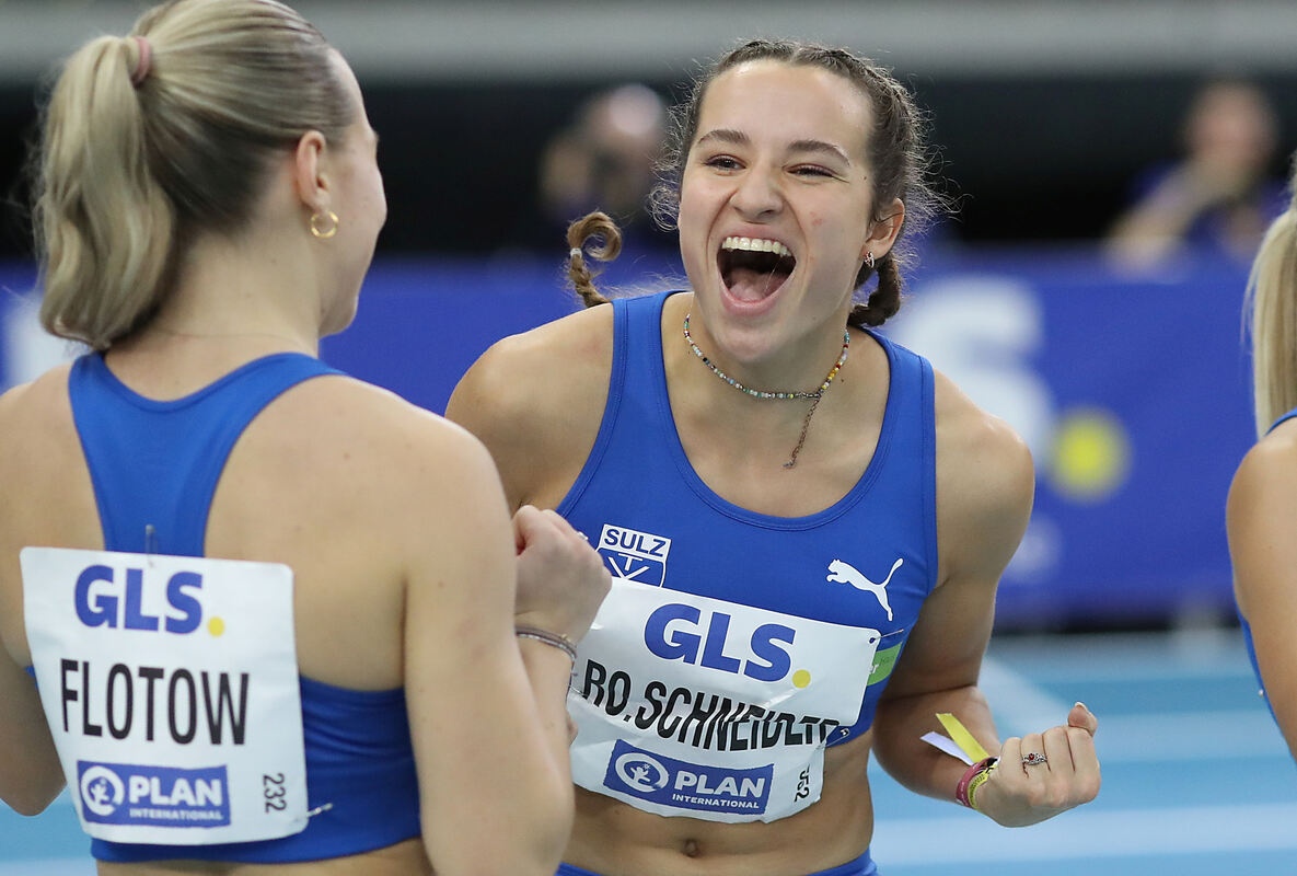 Rosina Schneider (rechts) kann kaum glauben, dass sie bei der deutschen Hallenmeisterschaft gewonnen hat.