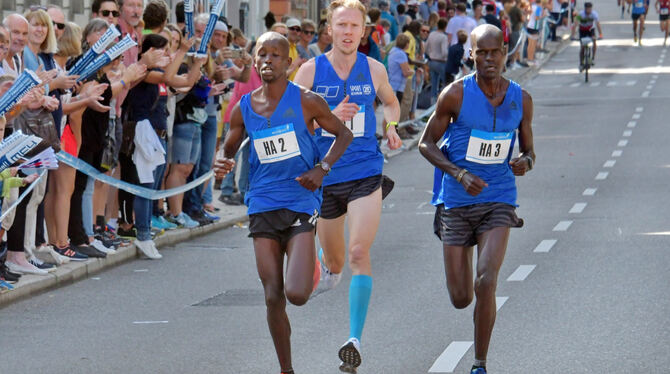 TÜBINGEN. Ein mächtiges Gewusel von Läuferinnen und Läufern hatte sich vor der Mensa, dem Start zum 25. Erbe-Lauf in Tübingen, gebildet. Kein Wunder bei insgesamt 495 Frauen und 1 166 gemeldeten Männern für die A- und B-Läufer über zehn Kilometer sowie für den Einsteiger- und Schülerlauf. Um 12.35 Uhr liefen dann die männlichen und weiblichen Asse auf den Drei-Runden-Kurs durch Tübingen. Aus der ersten Runde über 3,3 Kilometer kamen in 9:48 Minuten mit Dominic Kipngeno und Bethwel Kiprono zwei Kenianer und Richard Ringer vom VfB Friedrichshafen an der Neuen Aula vorbei. Bereits mit etwas Abstand folgten Marcel Fehr (SG Schorndorf) und Lorenz Baum (LAV Stadtwerke Tübingen). In der zweiten Runde nach 6,6 Kilometern war Ringer schon etwas von den Kenianern abgehängt. Diese Reihenfolge sollte sich bis ins Ziel nicht mehr verändern. Dabei lieferten sich die zwei Afrikaner aber noch ein sehenswertes Finish. Es siegte in starken 29:44 Minuten Dominic Kipngeno eine Sekunde vor Bethwel Kiprono. Dritter dann Richard Ringer in 30:16 Minuten.