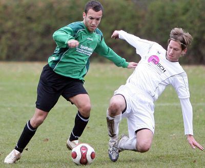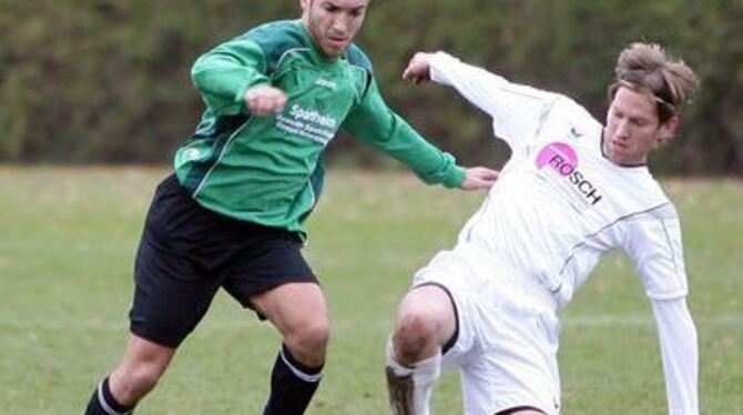 Timo Bintakies (rechts) vom TSV Sickenhausen attackiert den Sondelfinger Soufiane Behar.