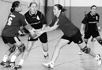 Sechs Arme, aber nur ein Ball. Isabel Kania (Mitte) von der SG Ober-/Unterhausen II im Duell mit Denise Holzner (links) und Christine Kienzle von der WSG Eningen-Pfullingen.