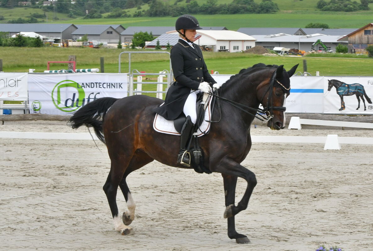 Die frühere Gestüts-Bereiterin Irina Oberthür gewinnt mit der Stute Salida de la Luna auf dem Münsinger Lerchenhof zwei schwere Dressuren. Foto: Meyer