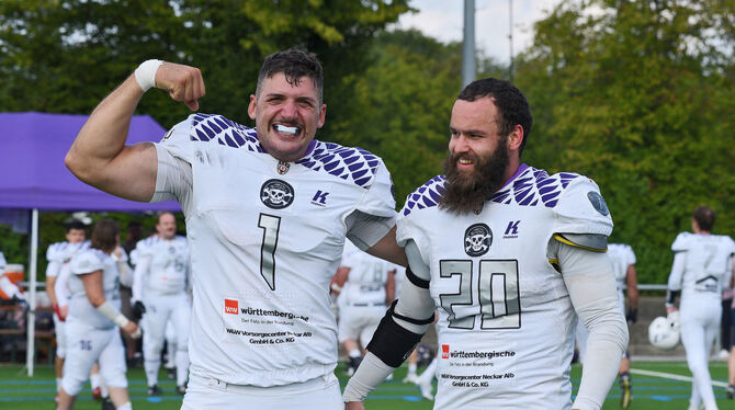 Jubelten nach dem Überraschungserfolg gegen den Meister Freiburg Sacristans: Benny Kotraci (links) und Lukas Grampp von den Reutlingen Eagles. foto: baur