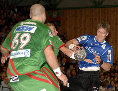 Kampf- und zweikampfstark: Markus Gaugisch (rechts), hier im Duell mit Sigfus Sigurdsson (links) und Christian Sprenger.