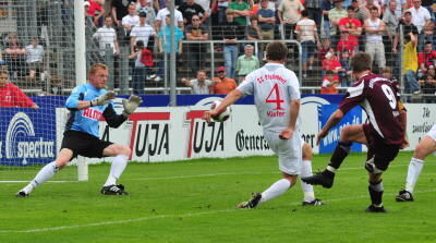 Auch bei diesem Schuss des SSVlers Christian Haas ist Torhüter Ralf Hermanutz zur Stelle.
