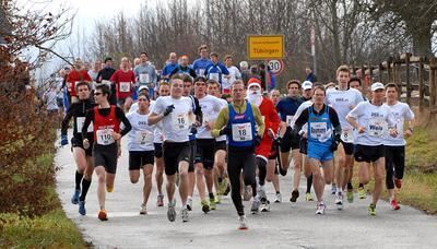 Lauter muntere Tübinger Nikolaus-Läufer mit dem späteren Sieger Dieter Baumann (Vierter von rechts) mittendrin.