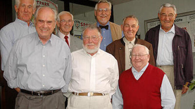Die in den fünfziger Jahren für Furore sorgenden Boxer des SSV Reutlingen feierten in der Sportparkgaststätte ein Wiedersehen. Hintere Reihe von links: Hans-Werner Hammermann, Otto Tahedl, Udo Wieland, Viktor Pogarzalek; vorne von links: Gerhard Speidel, Kalli Floten, Sigi Otter.