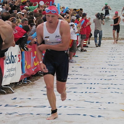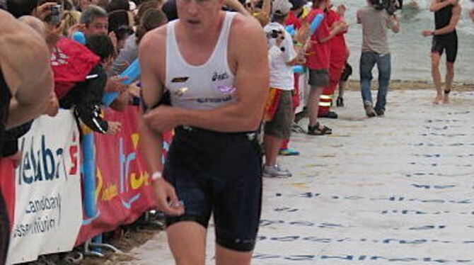 Nach dem Schwimmen geht's für Stephan Vuckovic im Laufschritt zum Rad.