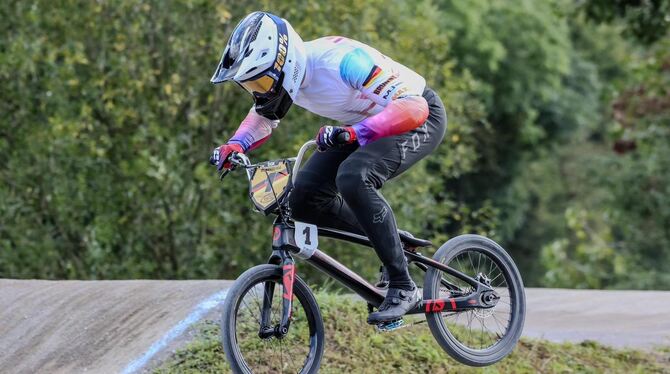 INGERSHEIM. Einmal mehr kaum zu bremsen war BMX-Fahrer Marco Jäckel vom TSV Betzingen beim fünften und sechsten Lauf der Bundesliga. In Ingersheim (Kreis Ludwigsburg) fuhr das Ass der Konkurrenz (Elite National) am ersten Tag davon und damit zu Start-Ziel-Siegen in allen Läufen. Auch am zweiten Wettkampftag demonstrierte Jäckel seine »überragende Stärke«, wie sein Club in einer Pressemitteilung schreibt, in den Vorläufen. Im Finale allerdings brachte er sein Können nicht auf die Strecke, aber auch das reichte zu Rang zwei.
