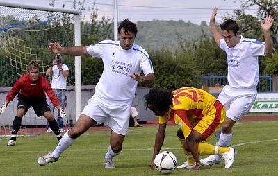 Gino Teixeira-Rebelo (links) und Martin Plawnia (rechts) versuchen, den Karlsruher Fnan Tewelde im Zaum zu halten.