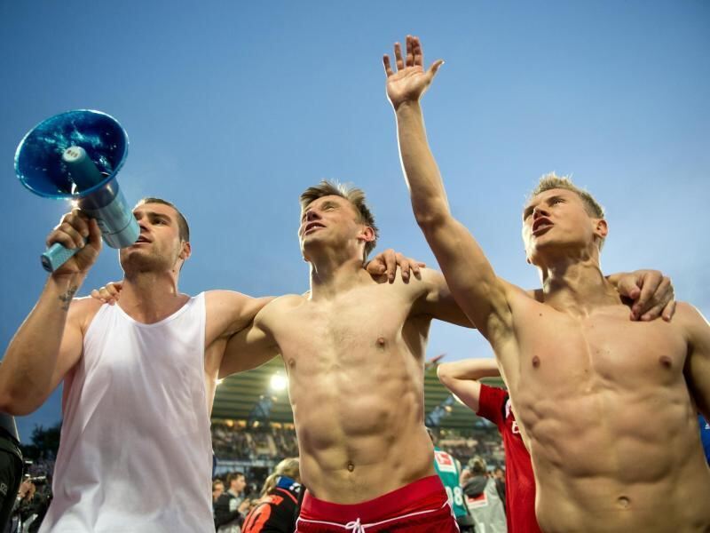 Die Hamburger Pierre-Michel Lasogga, Ivica Olic und Matthias Ostrzolek tanzen durch das Wildpark-Stadion. Foto: Daniel Naupold